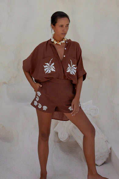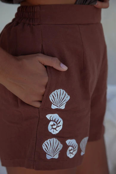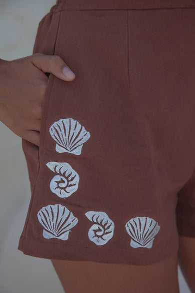 Our new embroidered 'Elise' Shorts in a brown and off-white colourway. Made from 100% durable woven cotton and featuring side pockets and shell embroidery detail on the front. This is a high-waisted short style with a relaxed easy fit, wide legs and an elastic casing waistband at the back. This means that the pant can be worn high-waisted, or on the lower hip. Style with our Summer Blouse or oversized print tees for the cutest fit. Exclusively by Palm Collective.