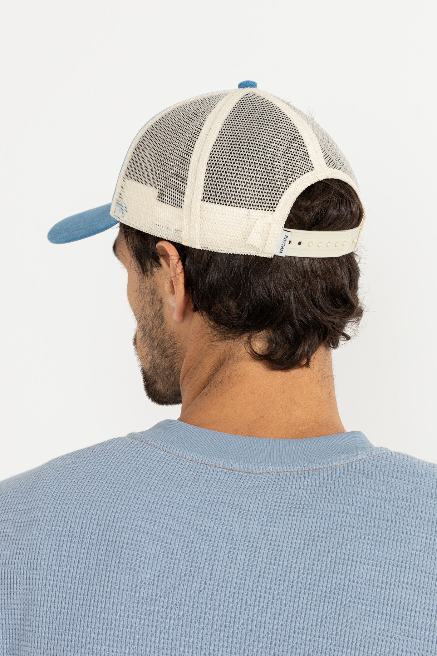 Experience timeless appeal with the Frame Trucker Cap in Blue. This structured trucker cap features a curved peak with a pigment-washed cotton crown and peak, creating a relaxed vibe. The mesh back ensures breathability, while the embroidered logo patch and adjustable snap back closure make it a staple accessory, finished with Rhythm labels and trims.