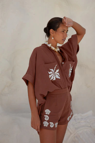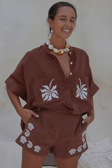 Our new 'Summer blouse' is an oversized large chocolate brown cotton blouse with a mandarin collar, and large patch pockets on the chest with embroidered detail. Made from a soft lightweight cotton voile, this blouse features a modern classic boyfriend fit, with a longer hem at the back, and batwing sleeves. Perfect layering piece with the Tide Pool skirt or shorts.
